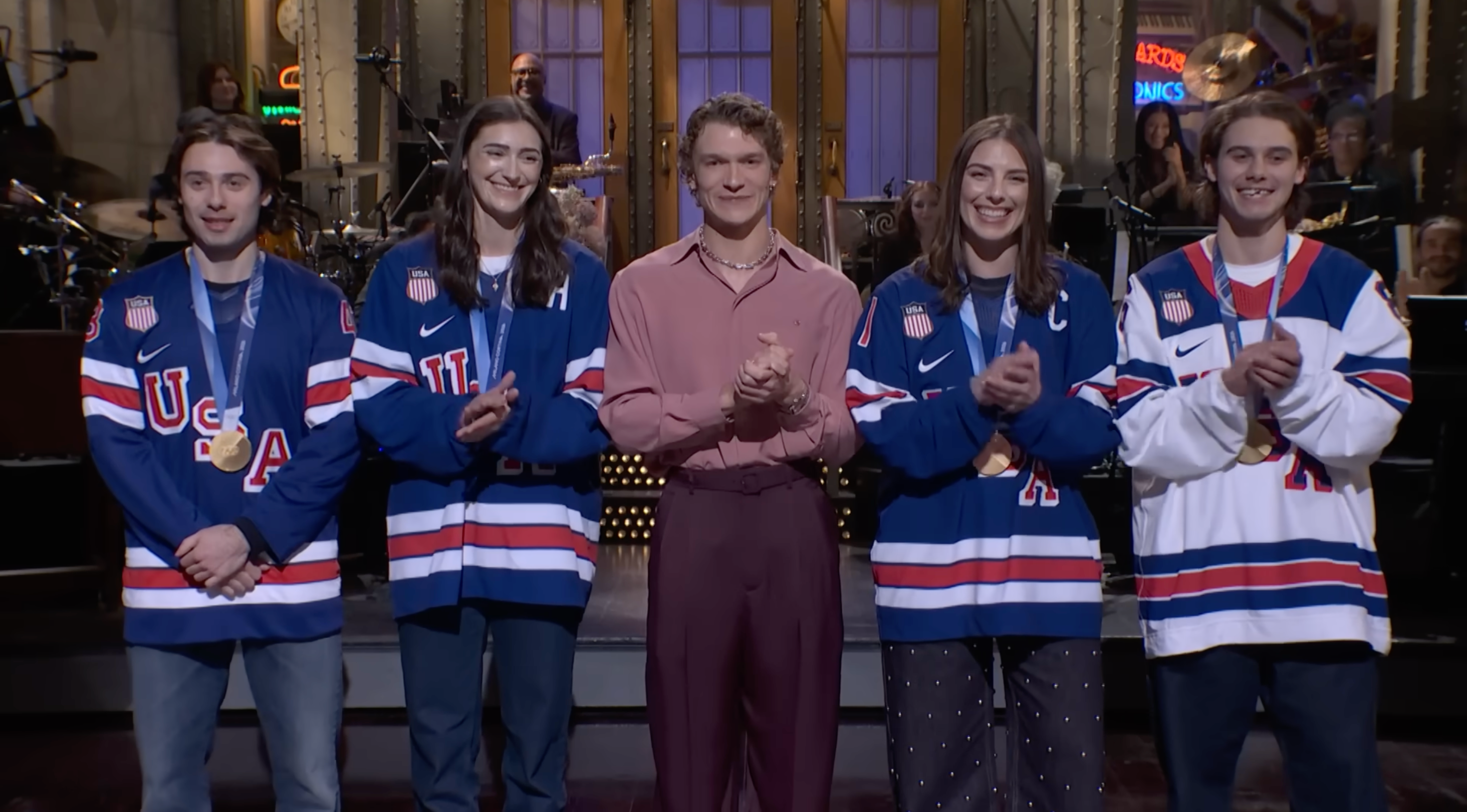 Olympic gold medal-winning hockey players Hilary Knight, Megan Keller, Jack Hughes and Quinn Hughes appeared on Saturday Night Live, making light of recent controversy.